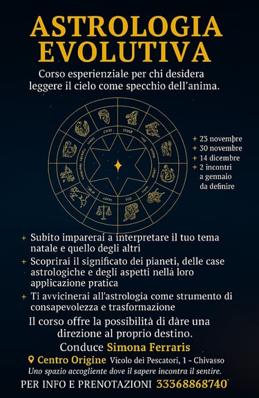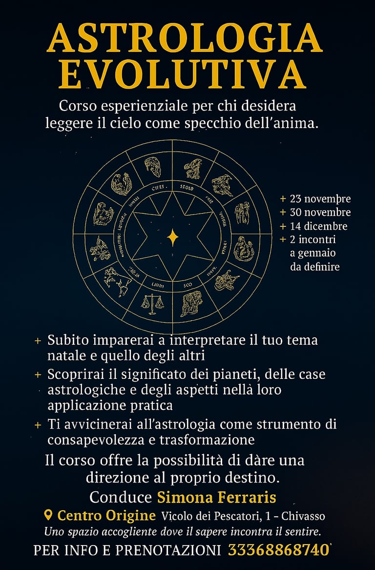 Questo corso esperienziale al Centro Origine con Simona Ferraris è un invito a entrare in questo viaggio, non solo per apprendere tecniche o significati, ma per vedere come ogni simbolo astrologico può diventare uno specchio: non tanto “chi sei” nel destino scritto, ma chi puoi diventare quando inizi a fare amicizia con le tue ombre e le tue luci.
